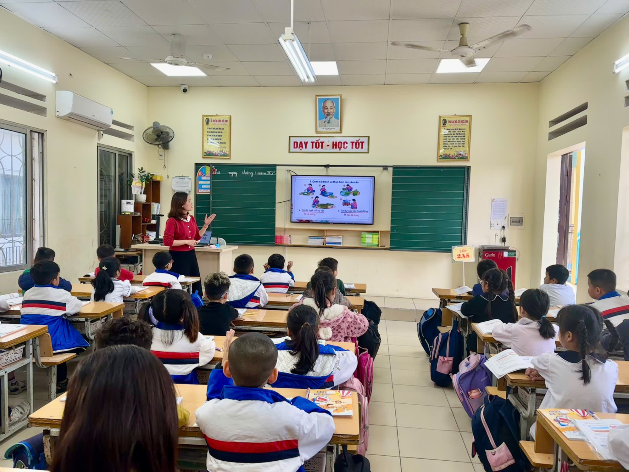 📗 Trong tiết học, giáo viên đã áp dụng linh hoạt các phương pháp và kĩ thuật dạy học tích cực như: thảo luận nhóm, băng chuyền dọc, dự án... trong giảng dạy tích cực... giúp các em tiếp cận kiến thức một cách tự nhiên và ghi nhớ hiệu quả. Đặc biệt qua tiết học, các em còn được tìm hiểu về những việc làm vào ngày Tết như gói bánh chưng, đi lễ hội, du xuân... Nổi bật hơn cả, các em được tìm hiểu về lễ hội Khai Bút đầu năm tại Khu tưởng niệm Vương Triều Mạc - Kiến Thuỵ - Hải Phòng.