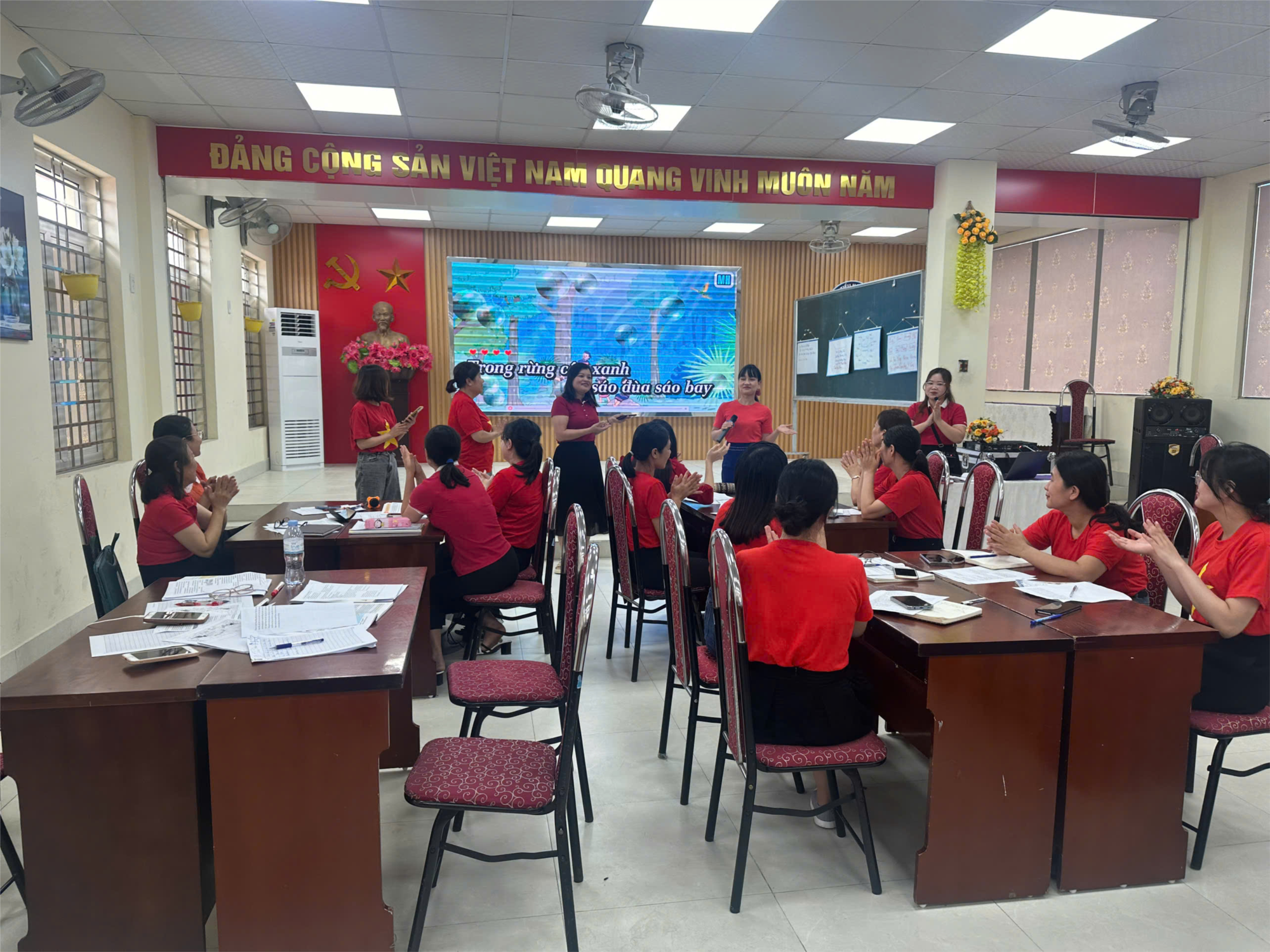 Đến dự với chuyên đề có các đồng chí trong Ban Giám hiệu nhà trường, các thầy cô trong hội đồng sư phạm vừa vào vai học sinh vừa là người đưa ra ý kiến trao đổi về các tiết dạy.