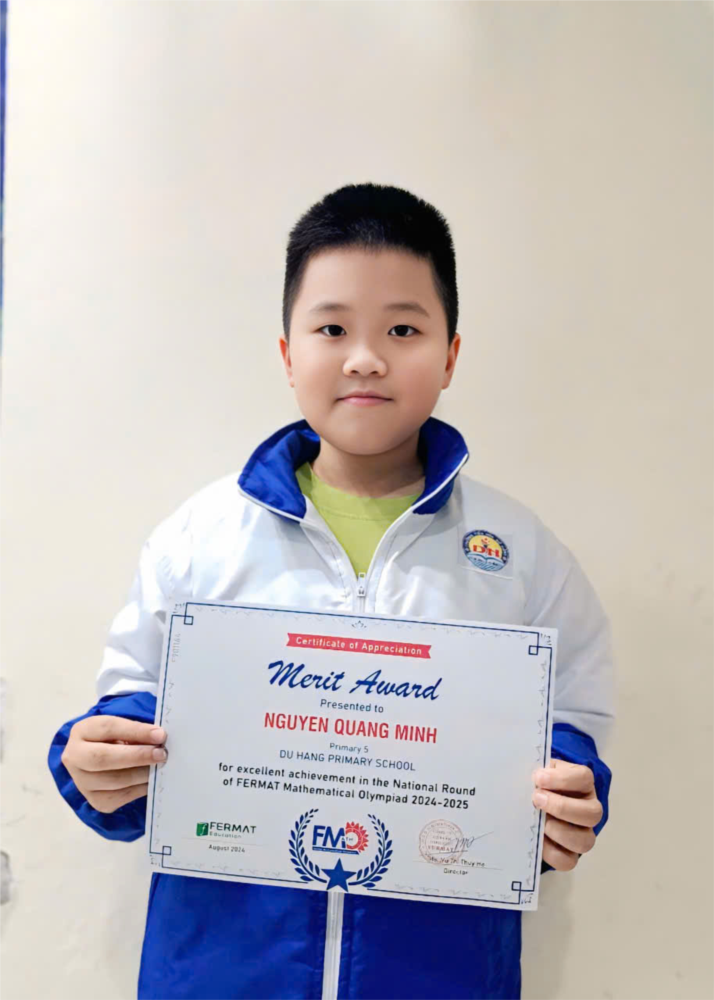 Với niềm yêu thích và đam mê Toán học, bạn Nguyễn Quang Minh, lớp 5A3 đã luôn tìm tòi, nỗ lực tìm ra cách giải các bạn toán hay, bài toán khó. Dù bên ngoài là một cậu bé trầm tính, ít nói, nhưng ở Minh có niềm say mê nghiên cứu tìm tòi. Năm học vừa qua, Minh đã thử sức với một số cuộc thi Toán học khu vực và quốc tế. . Bằng sự kiên trì, niềm đam mê học tập em đã nhận được phần thưởng xứng đáng với năng lực của mình.