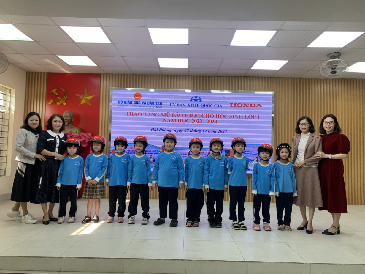 Thực hiện Công văn số 446/UBATGTQG ngày 04/10/2023 của Ủy ban An toàn giao thông (ATGT) Quốc gia, công văn số 6959/VP-GT ngày 11/10/2023 của UBND thành phố Hải Phòng, công văn số 40/BATGT ngày 11/10/2023 của Ban An toàn giao thông thành phố, công văn số 3625 /UBND-GDĐT ngày 19/10/2023 của quận Lê Chân về phối hợp tổ chức trao tặng mũ bảo hiểm cho học sinh lớp 1 năm 2023 với chủ đề “Giữ trọn ước mơ”, ngày 07/12/2023, trường Tiểu học Dư Hàng đã tổ chức trao tặng cho các em học sinh khối 1 những chiếc mũ bảo hiểm thật xinh xắn.