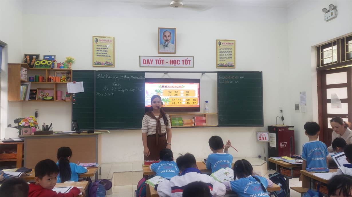 Đến dự chuyên đề có đồng chí Lê Thị Thu Hương – Hiệu trưởng, đồng chí Nguyễn Thị Kim Tuyến - Phó hiệu trưởng nhà trường, cùng các đồng chí giáo viên nhà trường. Phần lên lớp minh họa do cô giáo Phạm Thị Đài Trang và học sinh lớp 2A1 thực hiện qua Bài 23: Phép trừ (có nhớ) số có hai chữ số cho số có hai chữ số (tiết 2)